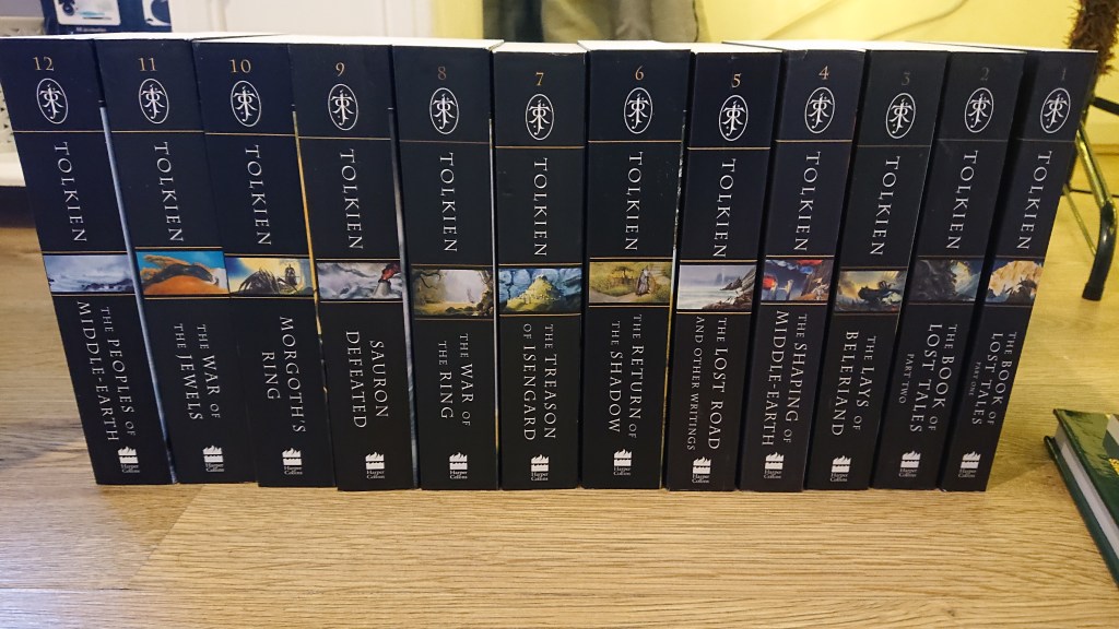 My plan for the new year, after reading the original trilogy, is to then read The Silmarillion, which gives an account of the Elder Days (or what is also known as the First Age) of Middle Earth. As a Christmas gift, Beth gave me the complete twelve volume series of The History of Middle Earth that also includes four volumes of The History of The Lord of the Rings to complete my collection. This series collects and analyses much of Tolkien’s legendarium, compiled and edited by his son Christopher Tolkien. Although I have read many academic papers on Tolkien and have spent hundreds of hours on Tolkien Gateway, various Wikis, and the Encyclopedia of Arda, studying so much lore, I have not read actually these volumes (and other companion books) from Christopher Tolkien.